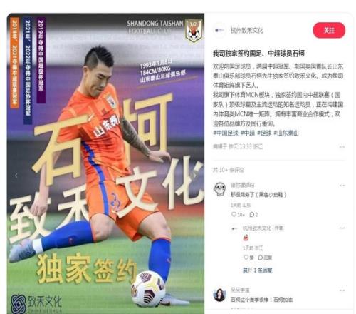 最近一段时间,有网友发现,山东泰山后卫石柯的抖音账号动态更新变得频繁起来。10月15日,“杭州致禾文化”小红书账号晒照并宣布——“前国足球员石柯独家签约致禾文化,成为我司体育矩阵旗下艺人。”