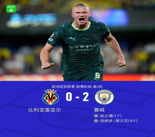 剑南春曼城20客胜比利亚雷亚尔,哈兰德、B席建功