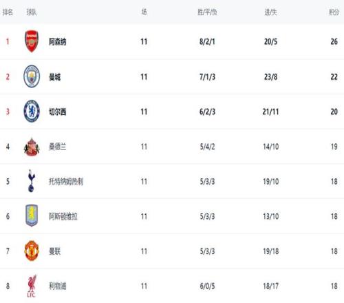 在积分榜上,阿森纳依然排名榜首,8胜2平1负,拿到26分。曼城赢球之后,总积分达到22分,升回第2名,只落后阿森纳4分。切尔西以20分排名第3。第4的是大黑马桑德兰,拿到19个积分。热刺、阿斯顿维拉、曼联、利物浦和伯恩茅斯这5支球队都是18分,欧冠资格的争夺非常激烈。