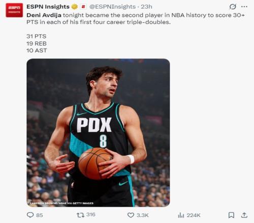 3.阿夫迪亚成为NBA历史第二位,生涯前四次三双有两次30+三双的选手;