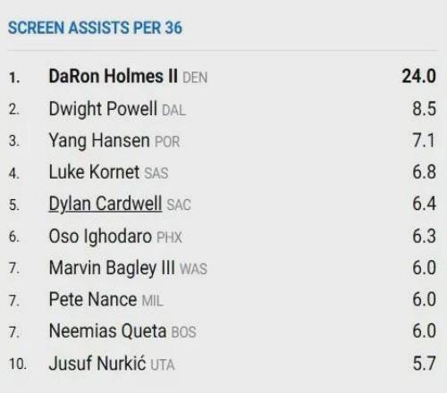 最后特别值得一提的是,据NBA官网统计杨瀚森本赛季至今每36分钟掩护助攻次数达到7.1次,高居联盟第三,仅次于达龙-霍姆斯以及德怀特-鲍威尔。