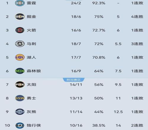湖人本赛季至今,以17胜7负排名西部第五,只落后第二的掘金1个胜场。
