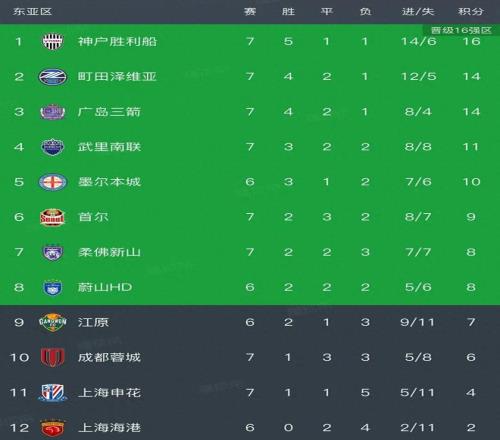 亚冠精英联赛最新积分榜:蓉城01排第10,申花02提前出局