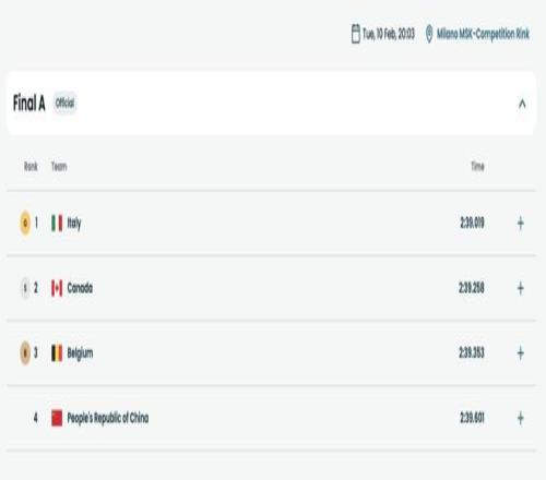 东道主意大利缔造“世界名画”,中国短道混团接力无缘领奖台