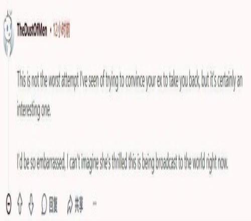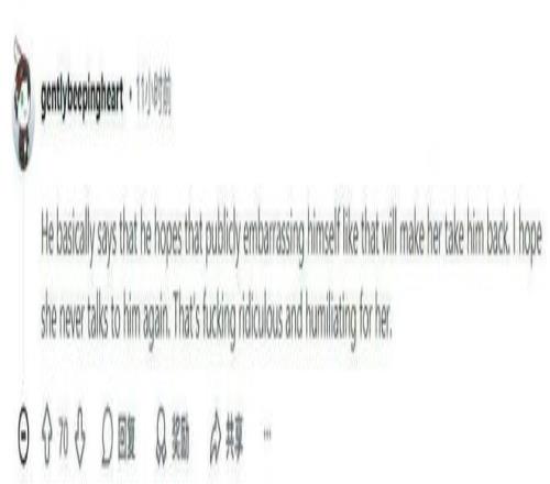 “他基本上是在说,希望通过这种公开出丑的行为让她回心转意。我希望她永远不要再跟他说话了,这太荒谬了,对她来说也太丢脸了。”