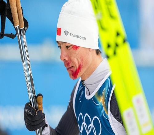 赵子贺在越野滑雪阶段的下坡路段因速度过快不慎摔倒,面部大面积擦伤、血迹明显,但他顽强坚持完成比赛。冲过终点线时,全场观众以热烈掌声向他致意。