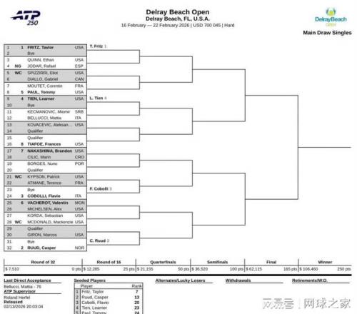 与此同时,在本周进行的级别最低的德拉海滩站,一众美国球员可谓倾巢出动,包括弗里茨、保罗、勒纳钱、蒂亚福等。首轮也有不少焦点对话,像前美网冠军西里奇将对阵布兰登中岛,科达则迎战持外卡参赛的布鲁克斯比等等。另外,意大利人科波利、挪威一哥鲁德、上海大师赛冠军瓦舍罗、卫冕冠军凯茨玛诺维奇也都联袂出战。