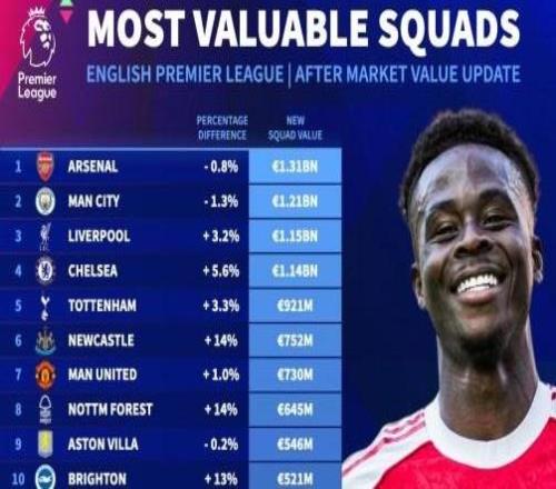 英超球队身价榜:阿森纳13.1亿欧居首,曼城第二利物浦第三