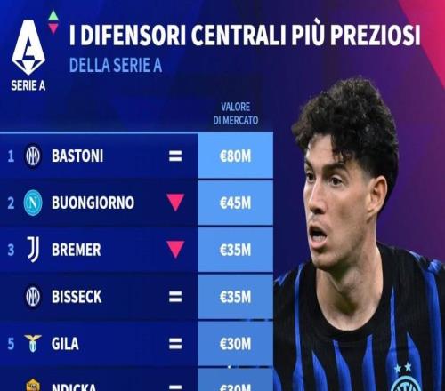 意甲中卫身价前10:巴斯托尼8000万断档第1,早安哥4500万第2