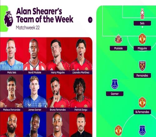 希勒评英超第22轮最佳阵:曼联5人在列,埃弗顿、西汉姆各2人 -