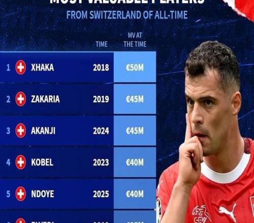 德转列瑞士球员历史身价前10:扎卡5000万欧第1,阿坎吉第2 -