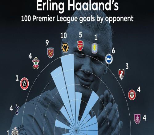 哈兰德英超100球分布:狼队10球最多,西汉姆9球、曼联8球 -
